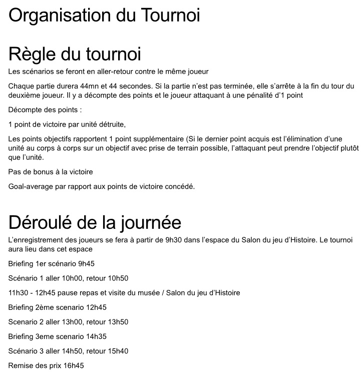 3 scenarios vous seront proposés, inscription sur le site. Début du tournoi à partir de 9h30 pour un début du premier scénario 9h45. Fin du tournoi vers 16h45.